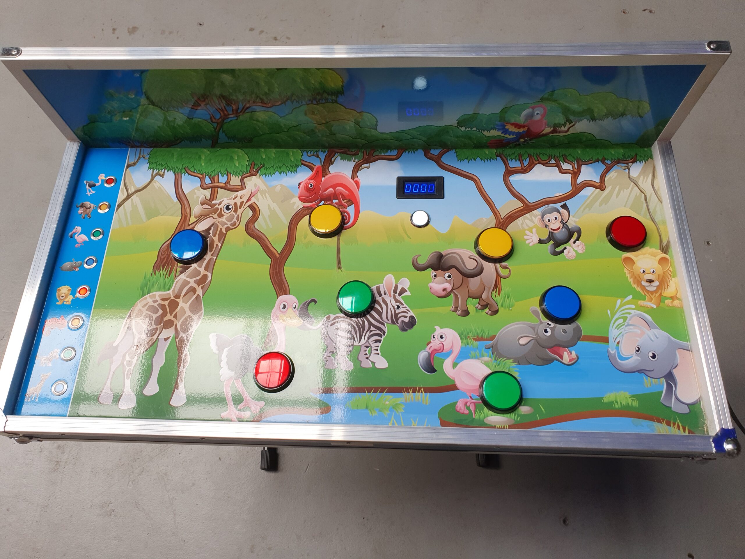 Een flitsend reactiespel voor iedere leeftijd. Willekeurig zal telkens bij een afbeelding aan de zijkant een led oplichten waarna de bijbehorende afbeelding op het bord zo snel als mogelijk moet worden opgezocht. Druk op de knop en vang binnen 1 minuut zoveel mogelijk punten. Voor dit spel heeft u stroom(220V) en een tafel om het spel op te zetten nodig.