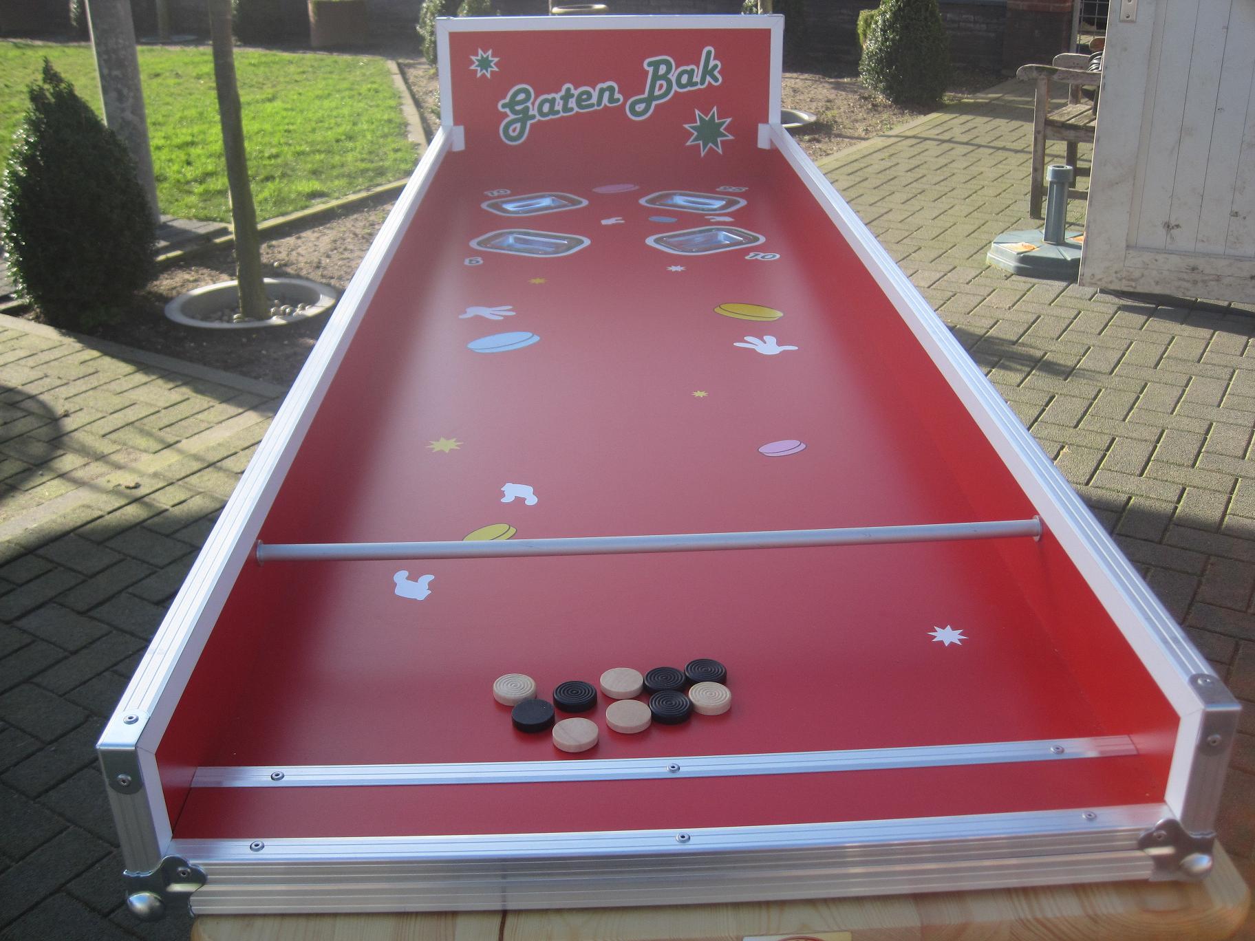 Schuif de schijfjes over de bak en laat ze belanden in de bakjes. De score van 3 beurten wordt bij elkaar opgeteld.