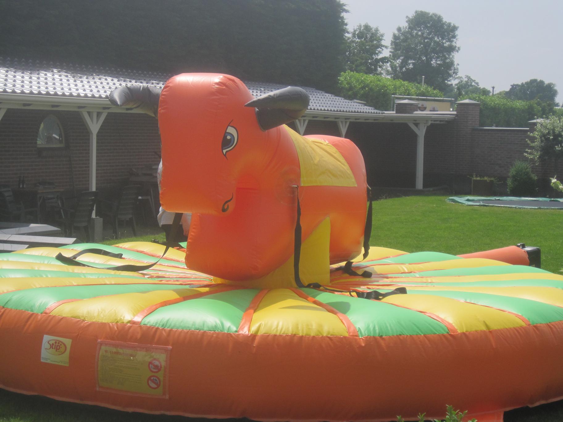Hij is super makkelijk en snel op te zetten. Door middel van de vier touwen aan de zijkanten wordt de stier in beweging gebracht, en wordt het een hele uitdaging om er op te blijven zitten.