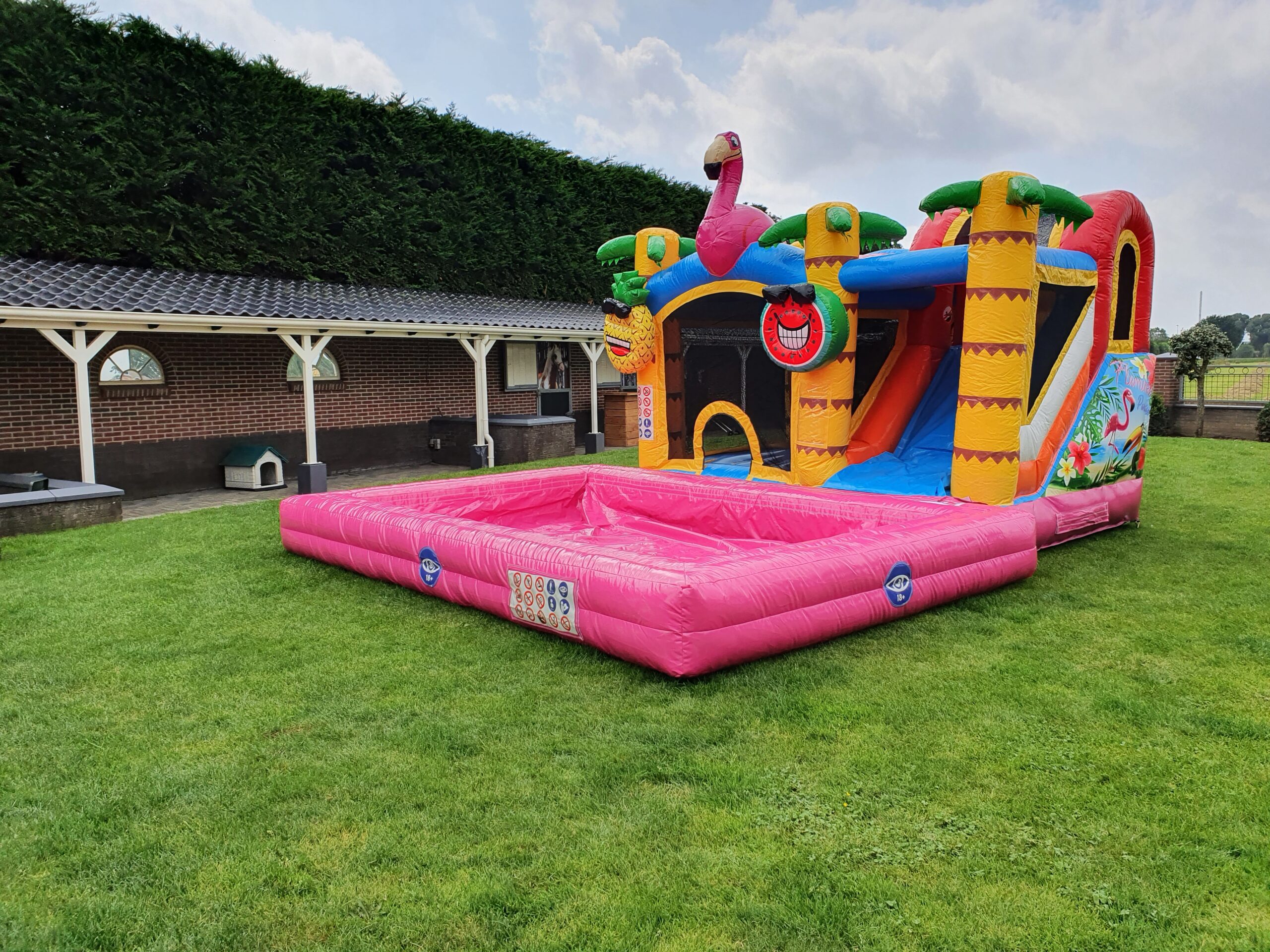 Dit super leuke springkussen happy flamingo met zwembad is geschikt voor 6 kinderen.