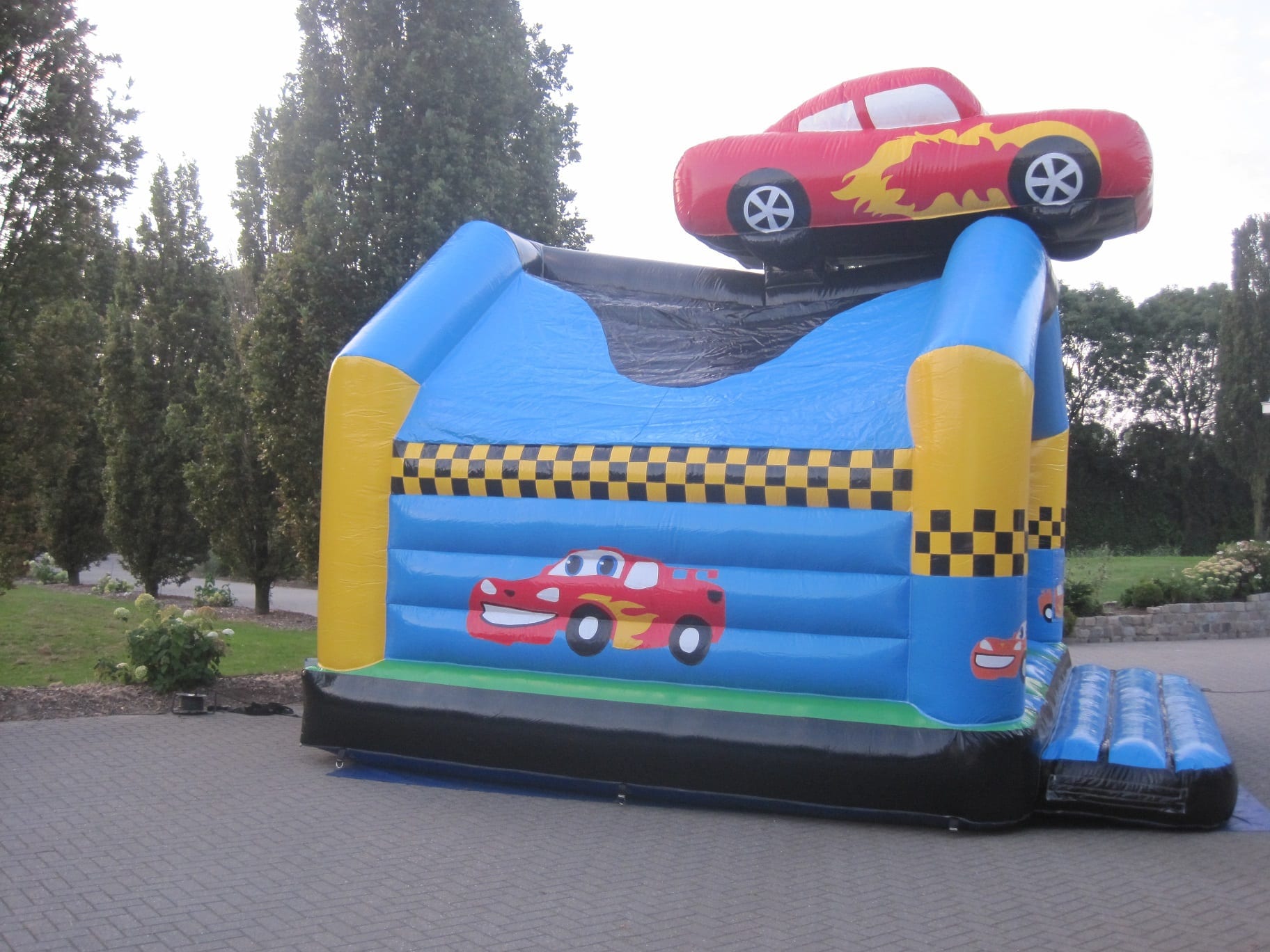 Het springkussen auto super heeft vrolijke animaties op de binnen- en buitenwanden en pilaren en op het dak zit een groot 3D car.
