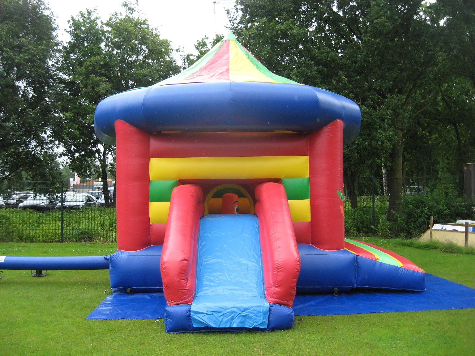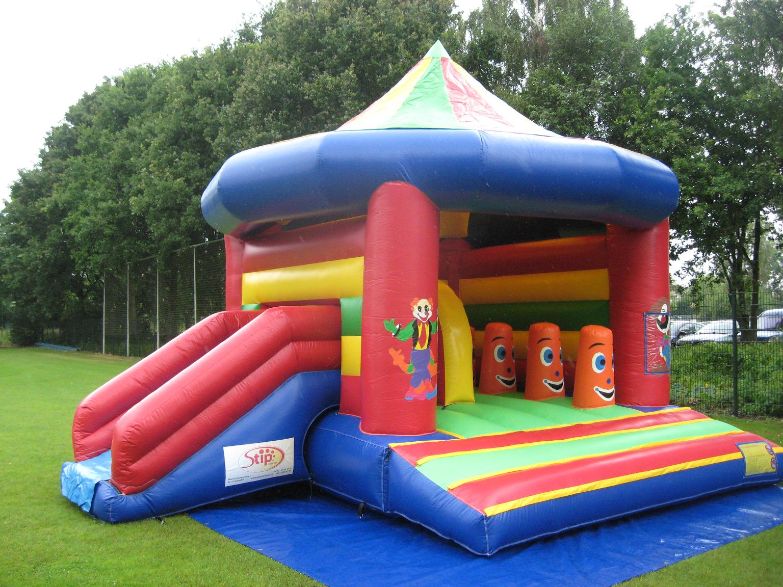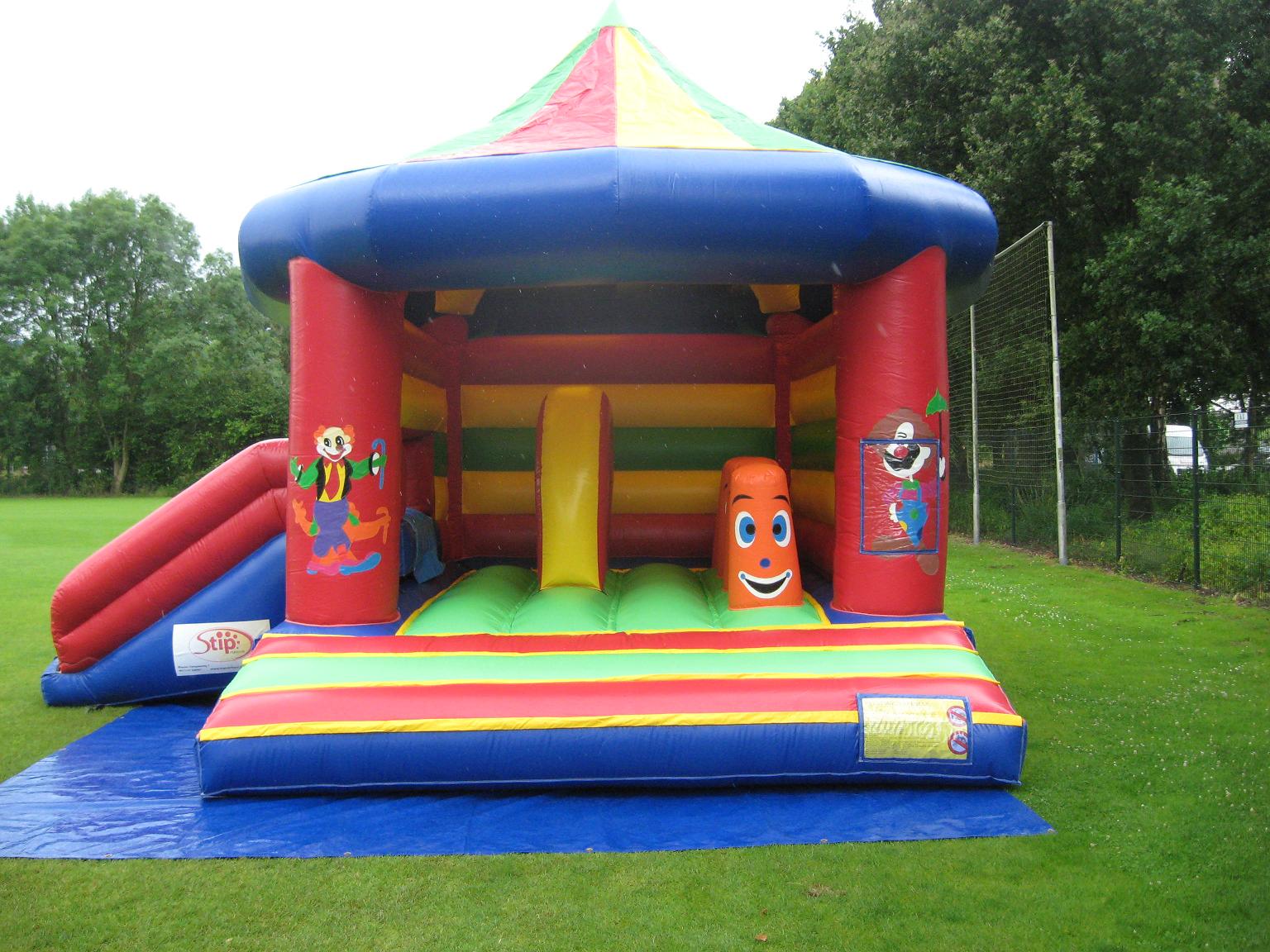 Dit unieke springkussen is een echte aandachtstrekker. Het springkussen is voorzien van speelpionnen en een leuke glijbaan.