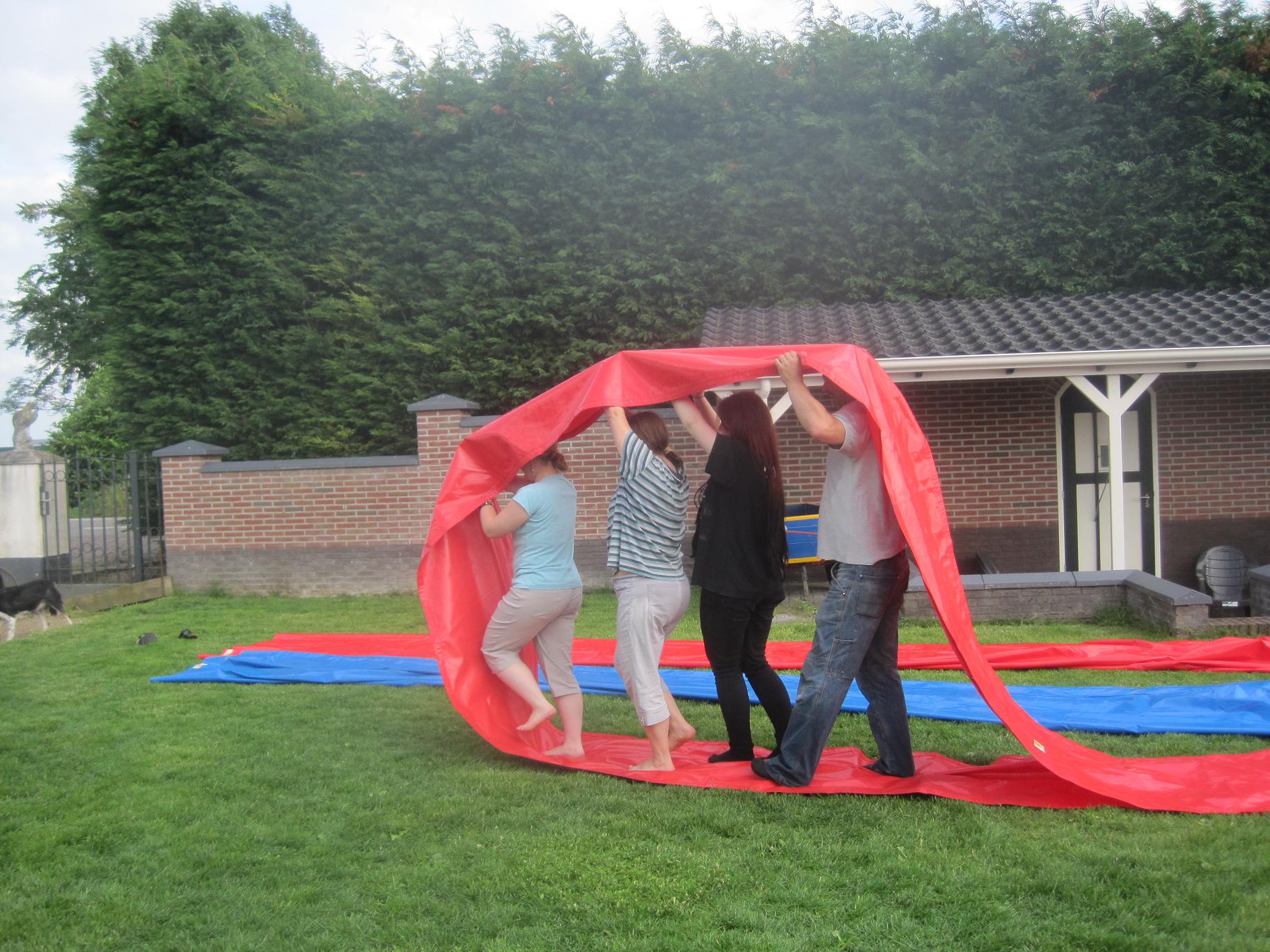 Het is de bedoeling dat 4-5 personen in deze funslang zo snel mogelijk vooruit proberen te komen. De teamleden geven het zeil van de funslang boven hun hoofden door naar voren en lopen op deze manier zo snle mogelijk naar de finish. De funslang is 10 meter lang.