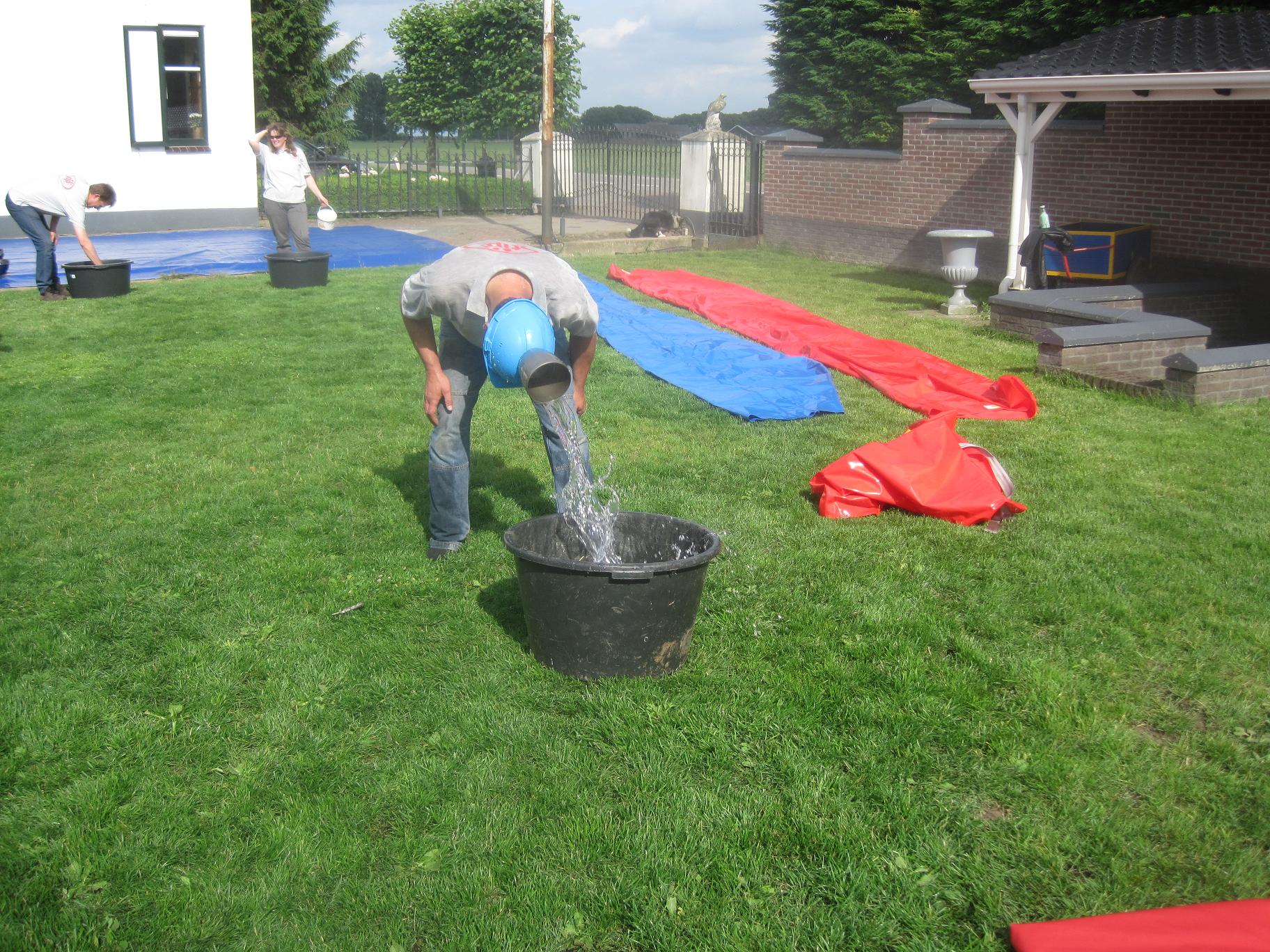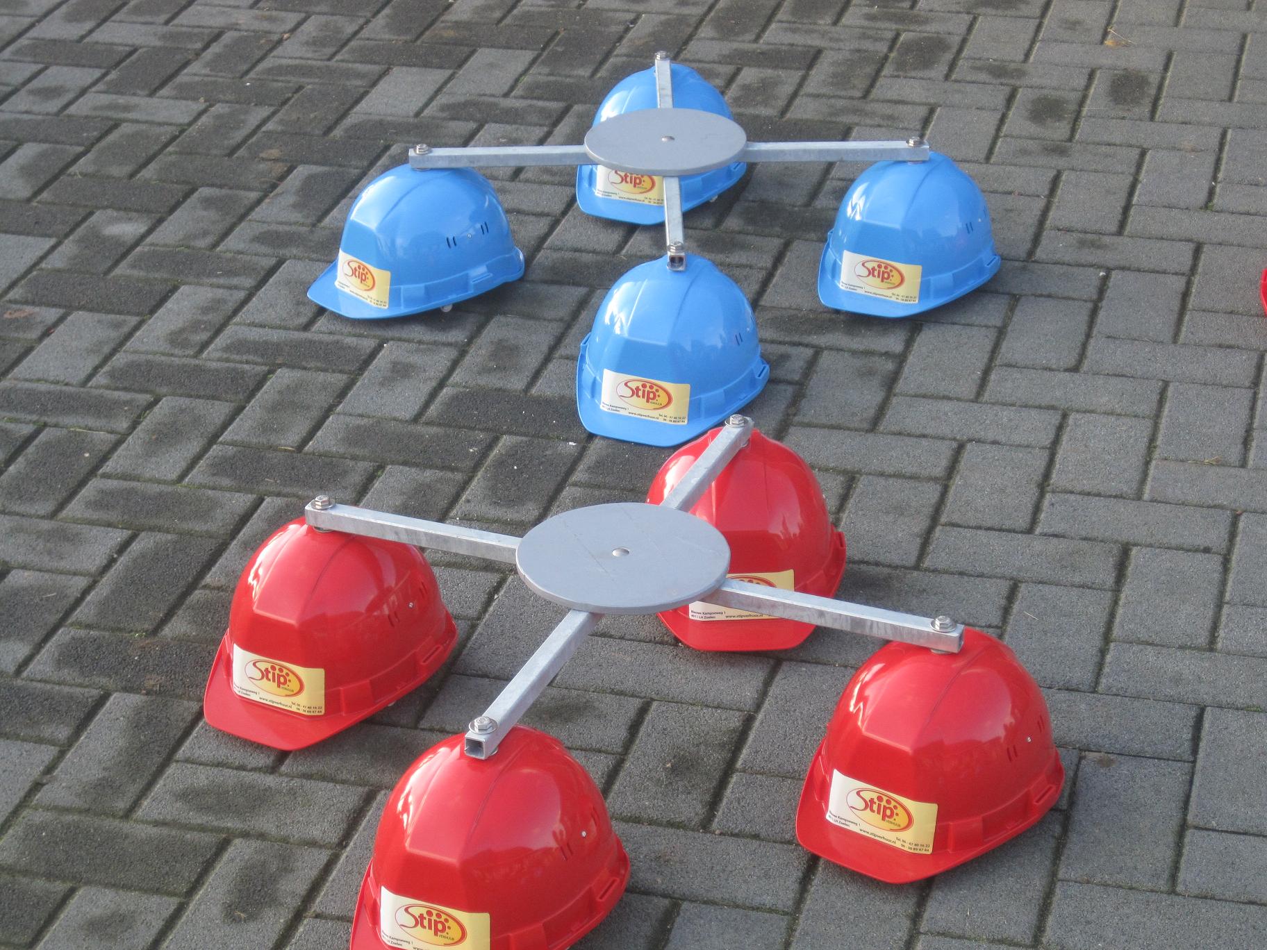 Probeer met je team, met een 2-3-4 persoons gekoppelde helm zoveel mogelijk emmers water van A naar B te brengen, zonder te morsen of het te laten vallen. Ook een leuk spel voor kinderen, plaats dan een pion i.p.v. een emmer..