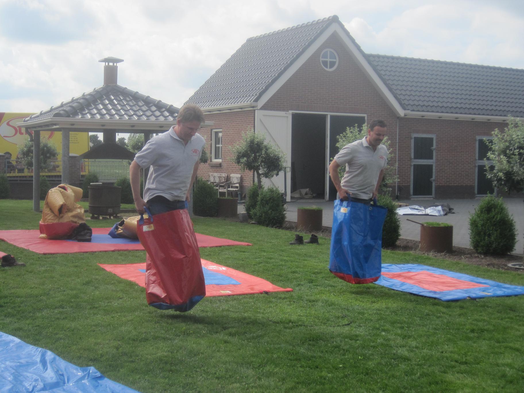 Zaklopen voor 1 persoon. Dit onderdeel mag niet ontbreken in een zeskamp.Sneller dan je tegenstander in een zak naar de overkant springen.